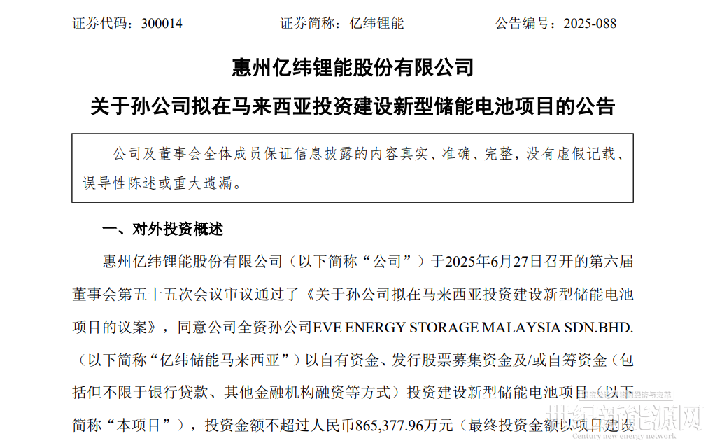 亿纬锂能6月27日晚间公告,公司全资孙公司EVE ENERGY STORAGE MALAYSIA SDN.BHD.(简称“亿纬储能马来西亚”)拟以自有资金、发行股票募集资金及/或自筹资金投资建设新型储能电池项目,投资金额不超过86.54亿元。