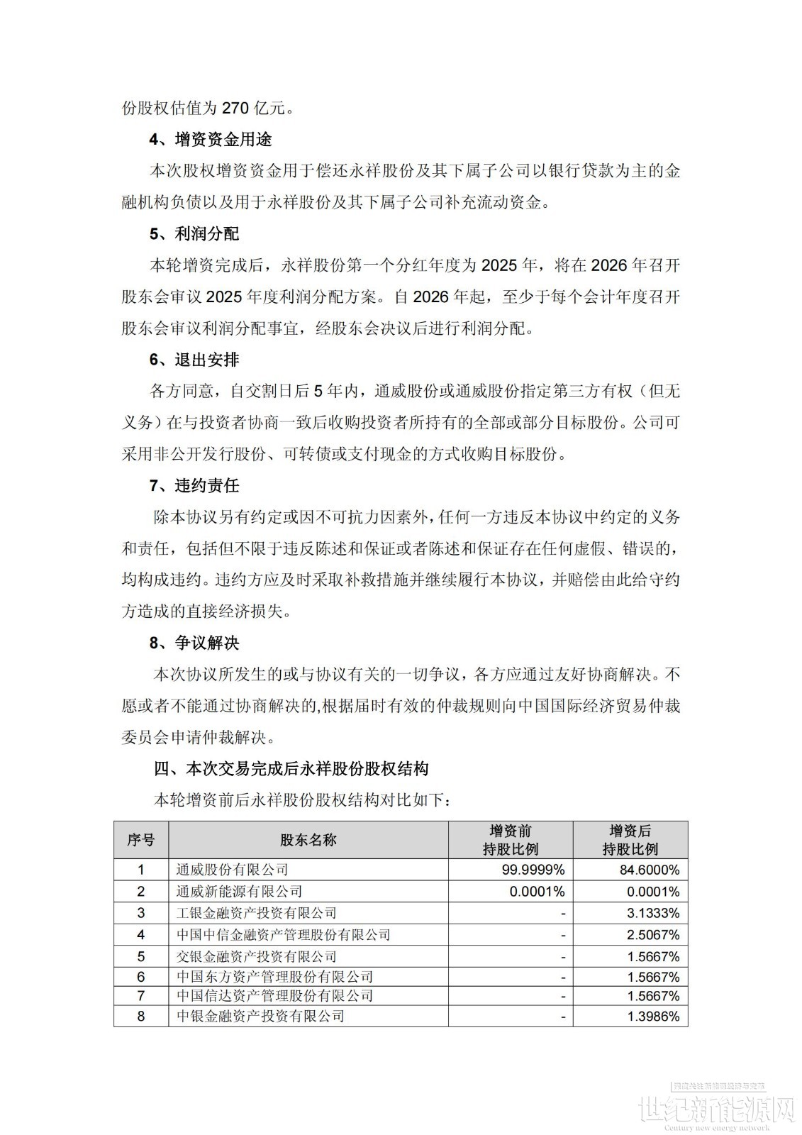 通威股份表示,截至目前,经审慎沟通与综合评估,永祥股份已与工银金融资产投资有限公司(领投方)、中国中信金融资产管理股份有限公司(领投方)、交银金融资产投资有限公司、中银金融资产投资有限公司、建信金融资产投资有限公司、中国东方资产管理股份有限公司、中国信达资产管理股份有限公司、永安期货股份有限公司、兴银理财有限责任公司、中金中鑫(安徽)新兴产业股权投资基金合伙企业(有限合伙)、四川振兴穗禾乡村股权投资基金合伙企业(有限合伙)等战略投资者就增资扩股事宜签署相关协议,收到战略投资者股权增资款合计约49.16亿元人民币。