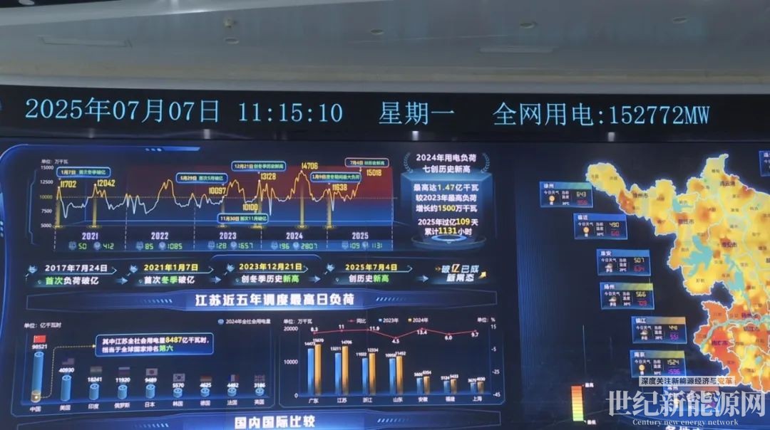 7月7日,江苏电网最高用电负荷年内第三次刷新历史新高,达1.52亿千瓦。