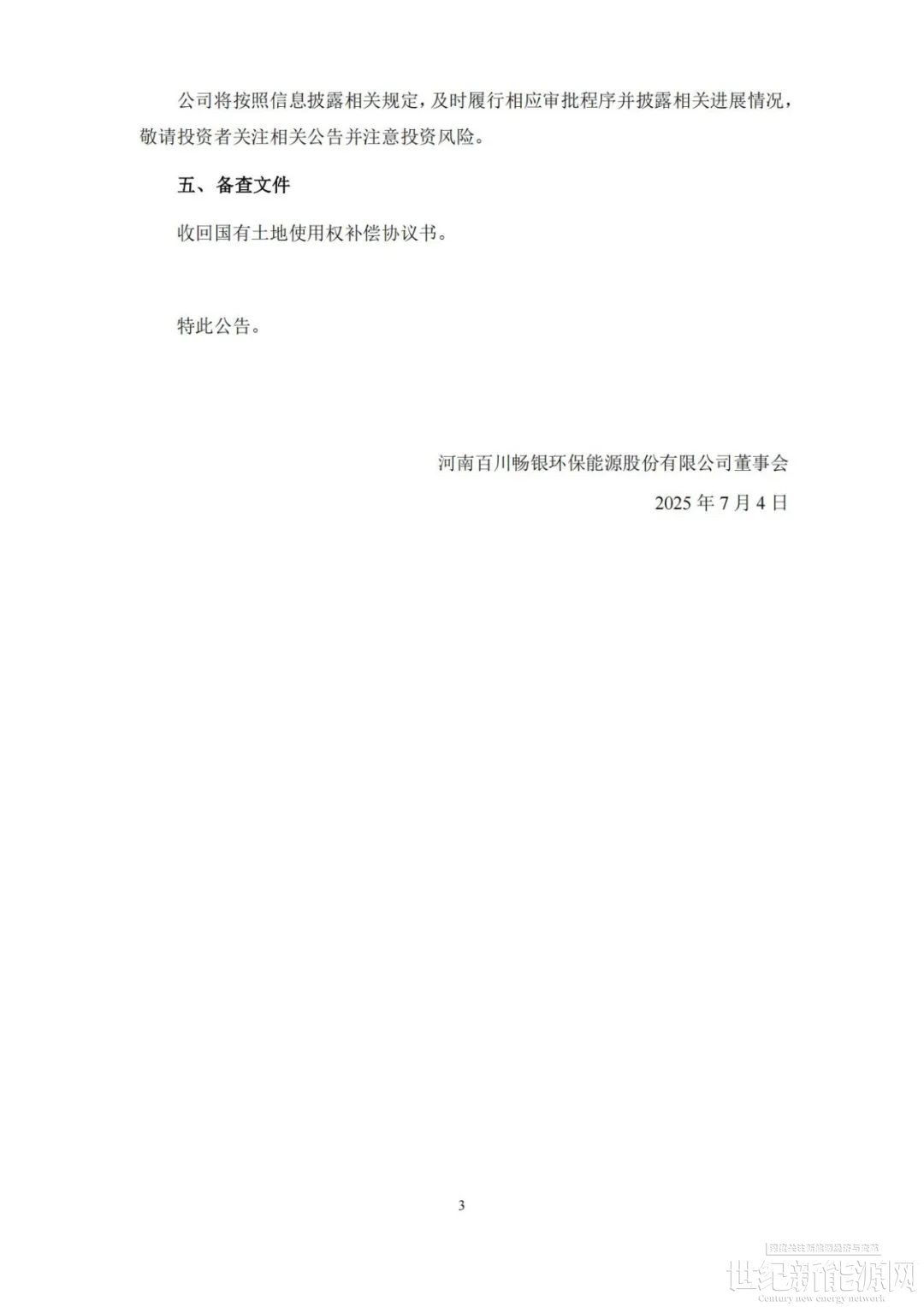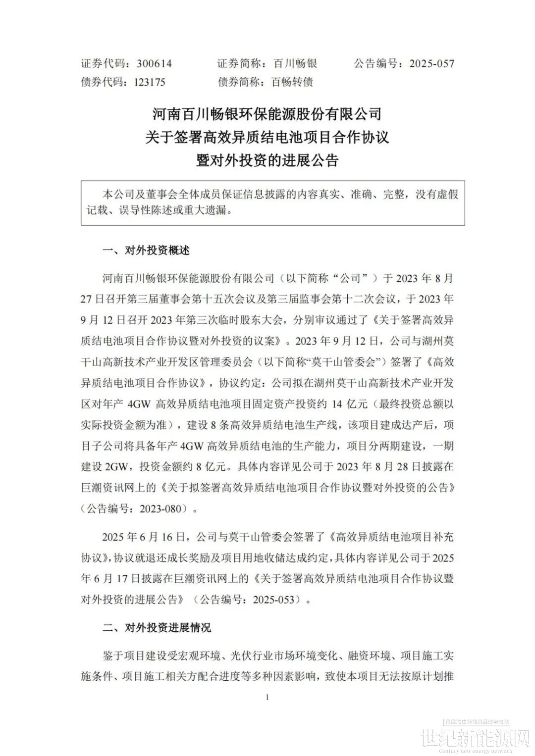 公告表示,河南百川畅银环保能源股份有限公司(以下简称“公司”)于2023年8月27日召开第三届董事会第十五次会议及第三届监事会第十二次会议,于2023年9月12日召开2023年第三次临时股东大会,分别审议通过了《关于签署高效异质结电池项目合作协议暨对外投资的议案》。2023年9月12日,公司与湖州莫干山高新技术产业开发区管理委员会(以下简称“莫干山管委会”)签署了《高效异质结电池项目合作协议》,协议约定:公司拟在湖州莫干山高新技术产业开发区对年产4GW高效异质结电池项目固定资产投资约14亿元(最终投资总额以实际投资金额为准),建设8条高效异质结电池生产线,该项目建成达产后,项目子公司将具备年产4GW高效异质结电池的生产能力,项目分两期建设,一期建设2GW,投资金额约8亿元。