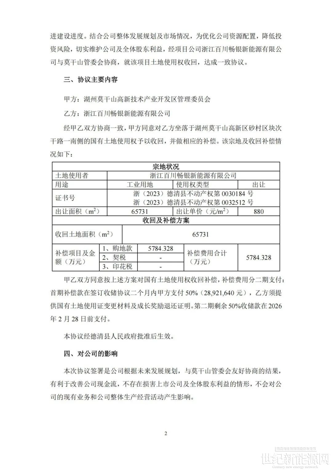 2025年6月16日,公司与莫干山管委会签署了《高效异质结电池项目补充协议》,协议就退还成长奖励及项目用地收储达成约定。