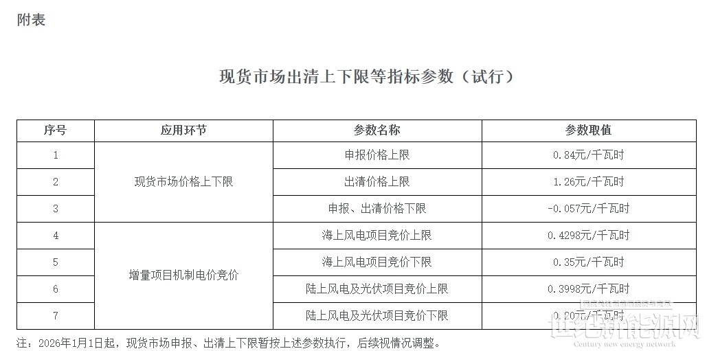 3.完善市场价格机制。适当放宽现货市场限价,现货市场申报、出清价格上限考虑目前省内燃料综合成本和用户承受能力等因素确定;申报、出清价格下限考虑新能源在电力市场外可获得的绿证收益、财政补贴等因素确定,后续根据市场运行情况适时调整。接受市场形成价格的新能源项目,结算价格按照所在节点的实时市场分时价格确定。价格上下限等具体参数见附表。