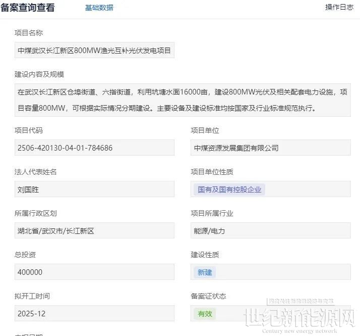 根据此前湖北省投资项目在线审批平台公示的备案信息,中煤武汉长江新区800MW渔光互补光伏发电项目为新建项目,总投资40亿元。