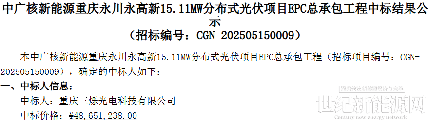 7月8日,中广核新能源重庆永川永高新15.11MW分布式光伏项目EPC总承包工程中标结果公示。
