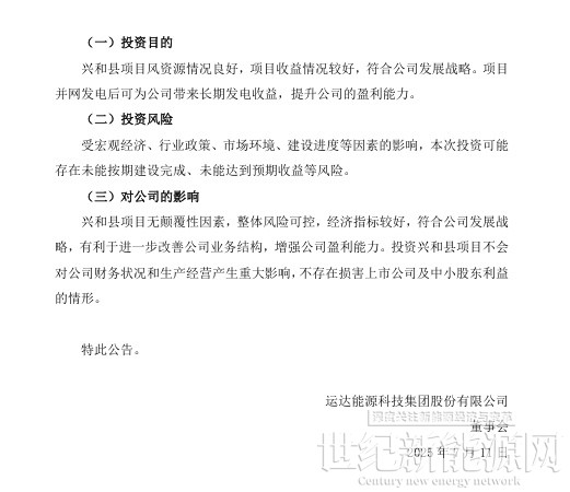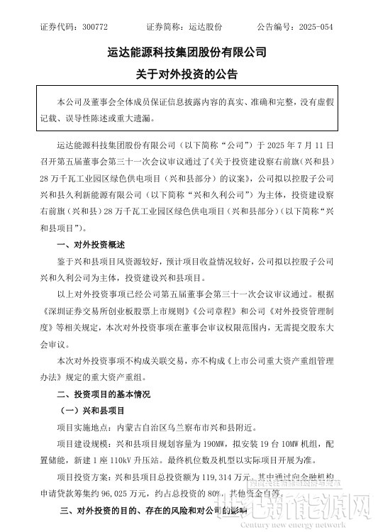 7月11日晚,运达能源科技集团股份有限公司(简称:运达股份,证券代码:300772)发布《关于对外投资的公告》。