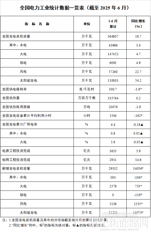 国家能源局发布2025年1-6月份全国电力工业统计数据