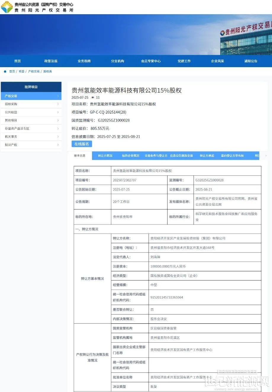 信息显示,项目名称为贵州氢能效率能源科技有限公司15%股权,转让底价为 805.55万元。转让方名称为贵阳经济开发区产业发展投资控股(集团)有限公司。