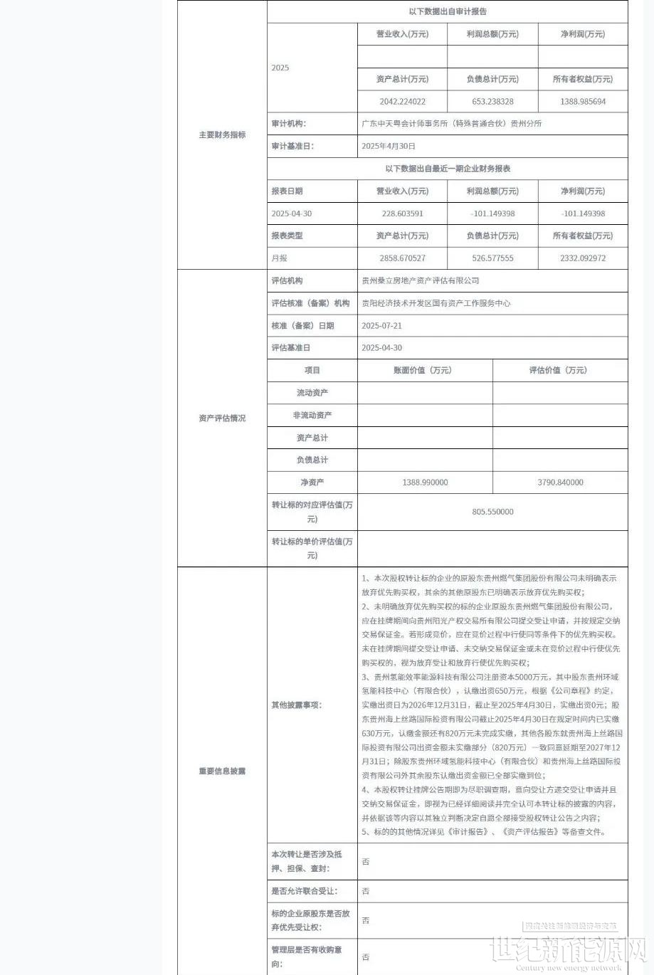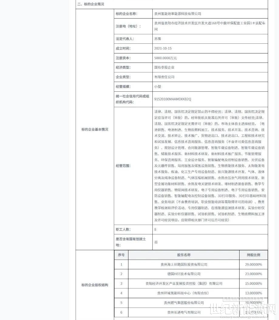 7月25日,贵州阳光产权交易所官网“产权交易”板块发布“”贵州氢能效率能源科技有限公司15%股权相关信息。