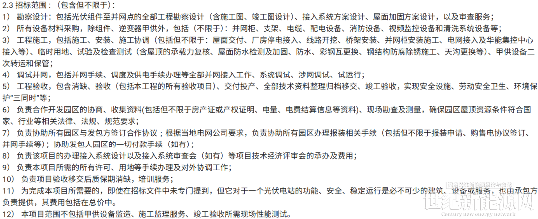 此外本次招标对投标人具有业绩要求,若独立投标的,投标人2022年1月1日至今,具有至少2项光伏工程EPC总承包业绩,其中至少包括1项容量不低于2MW的分布式项目EPC总承包业绩,不包括户用光伏项目。