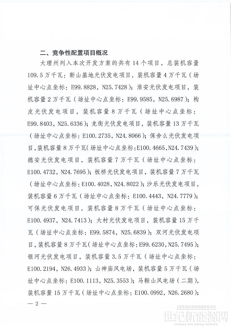 公告指出,大理州列入本次开发方案的共有14个项目,总装机容量109.5万千瓦。其中涉及12个光伏项目,容量共计895MW;2个风电项目,容量共计200MW。