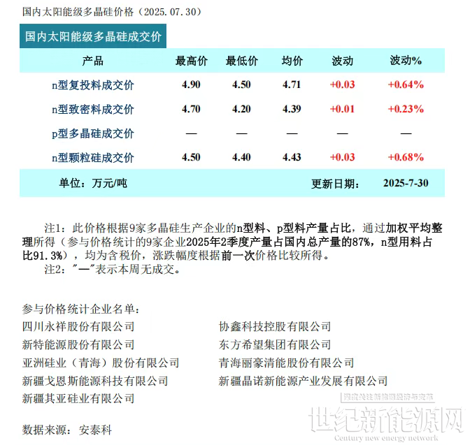 7月30日,硅业分会公布最新多晶硅价格。