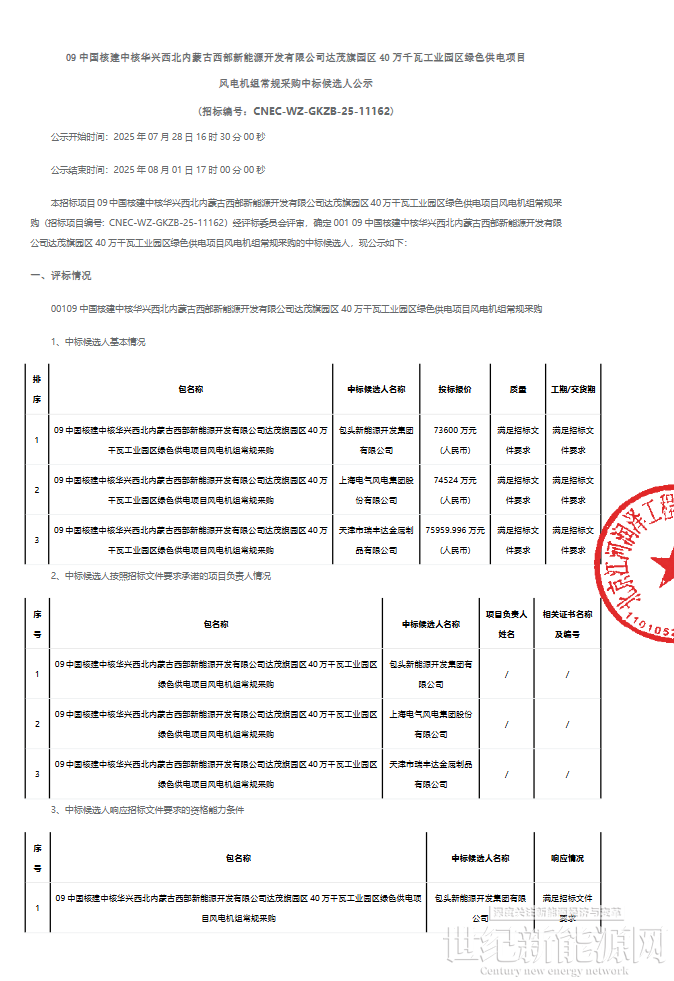 7月28日,中国核建中核华兴西北内蒙古西部新能源开发有限公司达茂旗园区40万千瓦工业园区绿色供电项目风电机组常规采购中标候选人公示。
