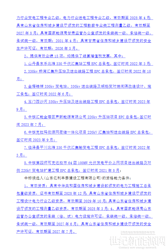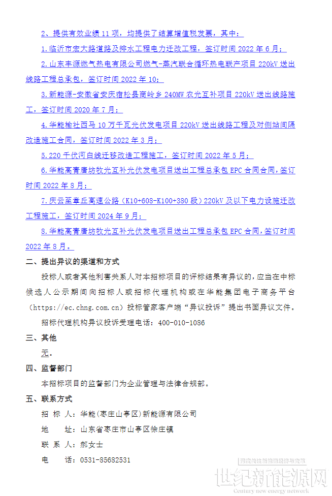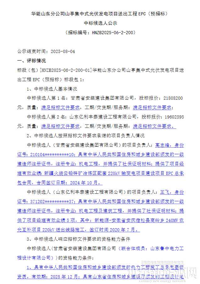 8月1日,华能山东分公司山亭集中式光伏发电项目送出工程EPC(预招标)候选人公示。