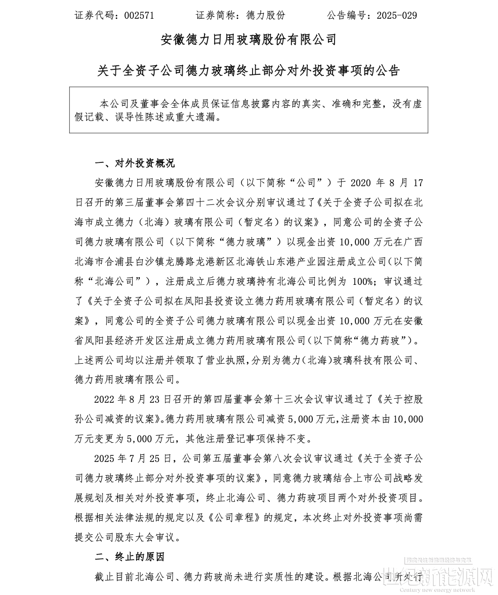 7月28日,德力股份公告称,2025年7月25日,公司董事会审议通过《关于全资子公司德力玻璃终止部分对外投资事项的议案》,同意德力玻璃结合上市公司战略发展规划及相关对外投资事项,终止北海公司、德力药玻项目两个对外投资项目。根据相关法律法规的规定以及《公司章程》的规定,本次终止对外投资事项尚需提交公司股东大会审议。