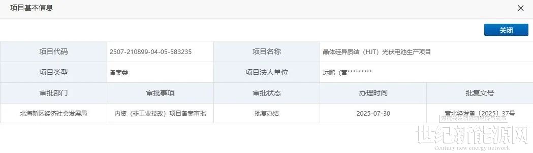据辽宁省投资项目在线审批监管平台显示,位于辽宁的一晶体硅异质结(HJT)光伏电池生产项目获备案于7月30日通过备案。据悉该项目或由远鹏在营口北海经济开发区投资建设。