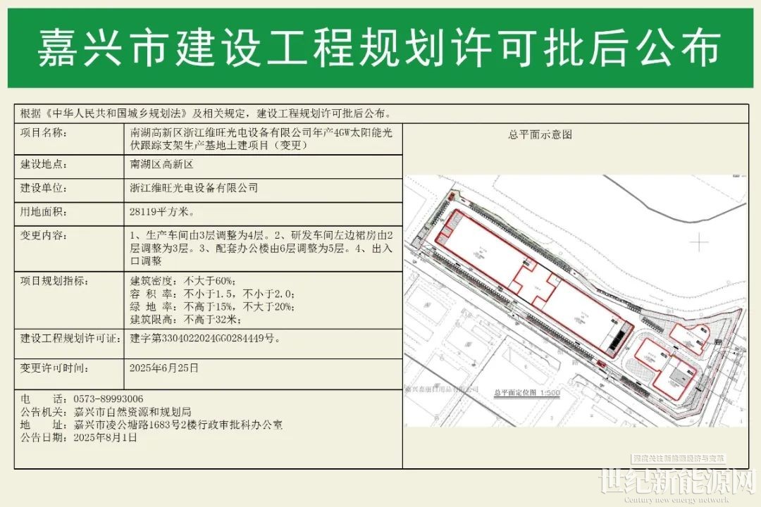 8月1日,浙江嘉兴市自然资源和规划局发布了《南湖高新区浙江维旺光电设备有限公司年产4GW太阳能光伏跟踪支架生产基地土建项目(变更)》的批后公示公告。