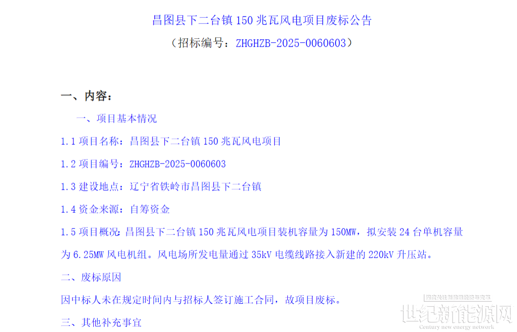 8月6日,中国招标投标公共服务平台发布《昌图县下二台镇150兆瓦风电项目废标公告》。