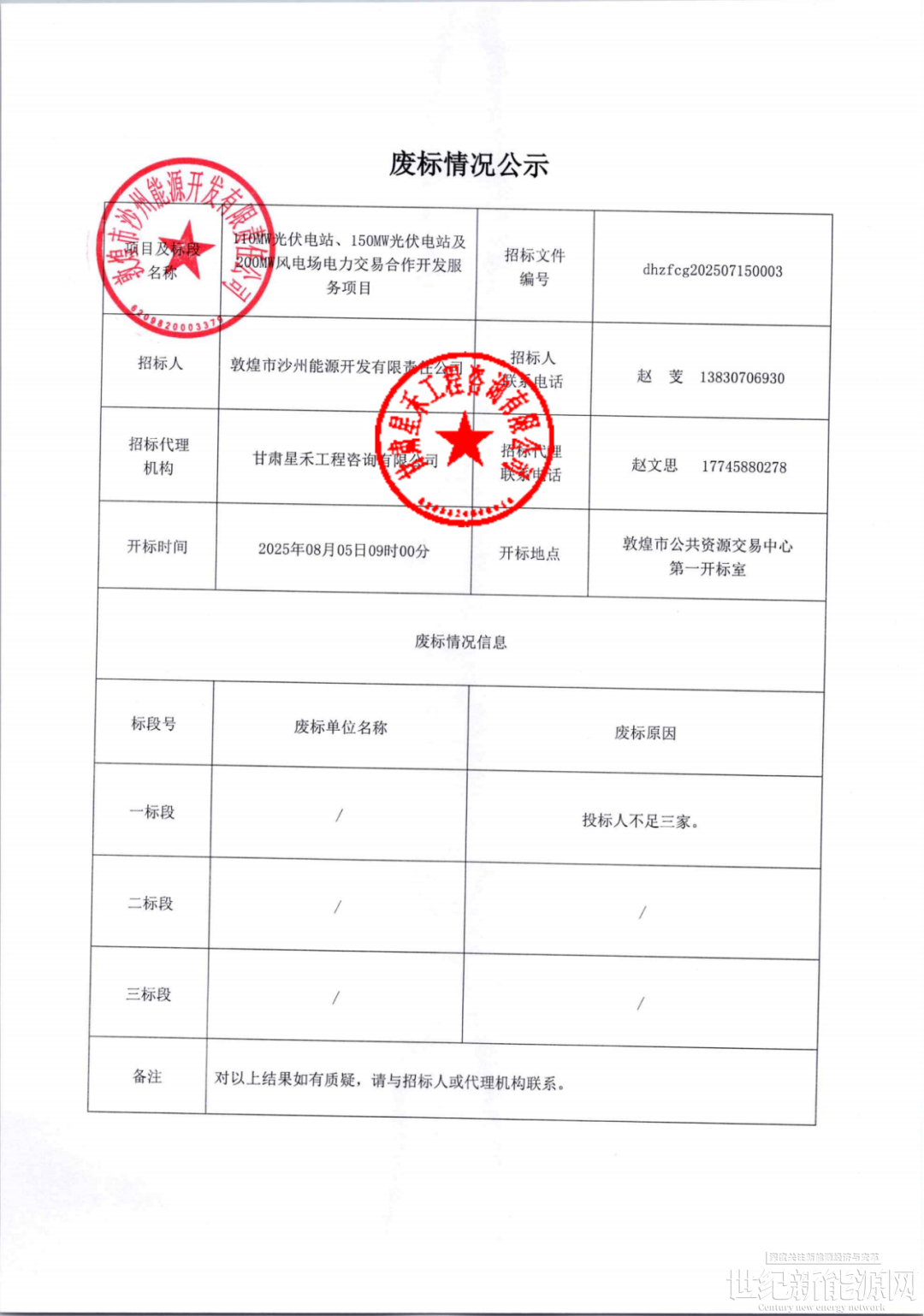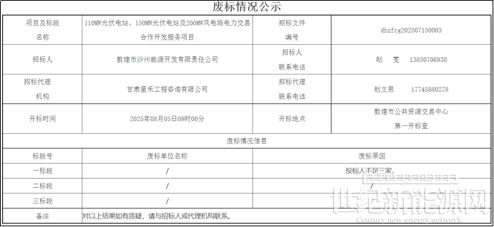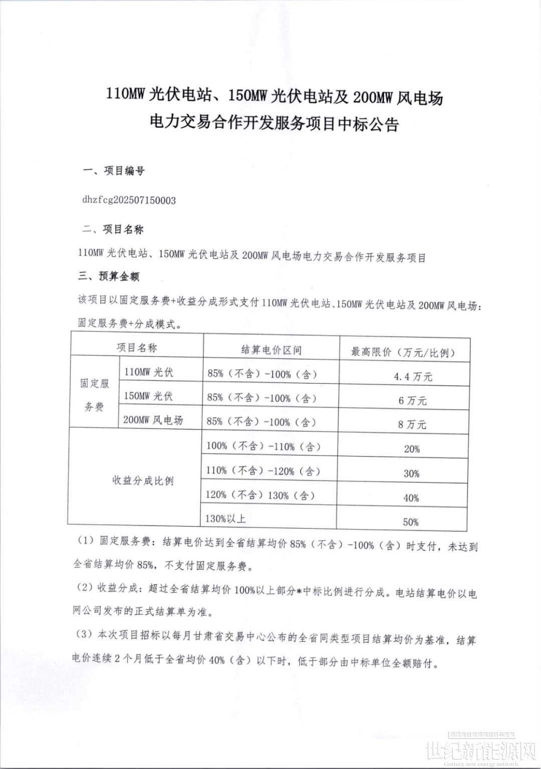 8月7日,敦煌市110MW光伏电站、150MW光伏电站及200MW风电场电力交易合作开发服务项目中标公告(以下简称“《公告》”)发布。