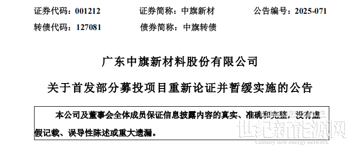 8月7日晚间,中旗新材(001212)发布关于首发部分募投项目重新论证并暂缓实施的公告。