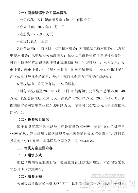 盘江新能源发电(镇宁)有限公司是盘江股份全资子公司,成立于2022年10月8日,注册资本为6900万元。增资完成后,盘江新能源发电(镇宁)有限公司的注册资本将增至1.25亿元,公司仍将持有其100%股权。此次投资占公司最近一期经审计净资产的0.54%,符合公司的发展战略,有利于推动公司高质量发展。