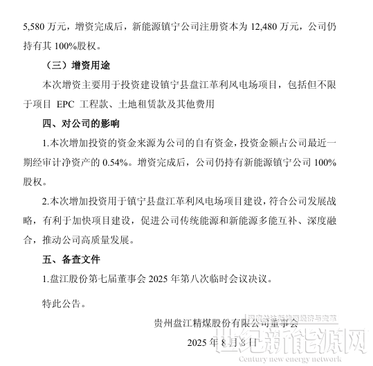 近日,盘江股份发布公告称,公司拟向盘江新能源发电(镇宁)有限公司增加投资5580万元。此次增资的主要目的是为了支持新能源镇宁公司投资建设镇宁县盘江革利风电场项目,该项目总投资为2.79亿元,按照不低于20%的项目资本金要求,增资将满足项目建设需要。
