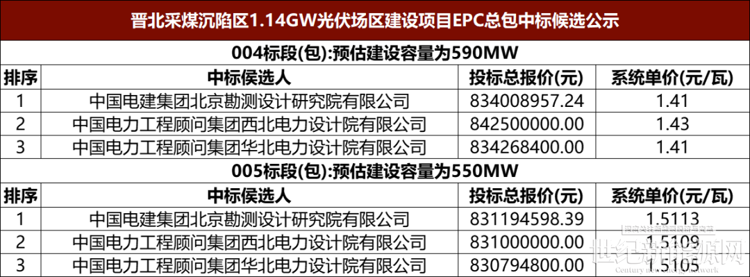 004标段(包)名称:晋北采煤沉陷区新能源基地(新荣)170万千瓦光伏发电项目新荣北59万千瓦光伏场区建设项目(包含集电线路),中国电建集团北京勘测设计研究院有限公司以1.41元/瓦位列第一候选人;