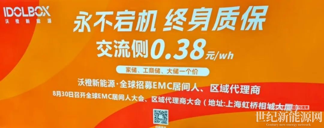 8月13日,第四届EESA储能展开幕,在现场沃橙新能源的展位成了焦点之一 ——其海报上 “交流侧0.38元/Wh,家储、工商储、大储一个价,永不宕机,终身质保” 的标语,一时激起千层浪。这组数字的冲击力,不仅颠覆了行业对价格的认知,更引发了关于成本与服务可持续性的广泛讨论。