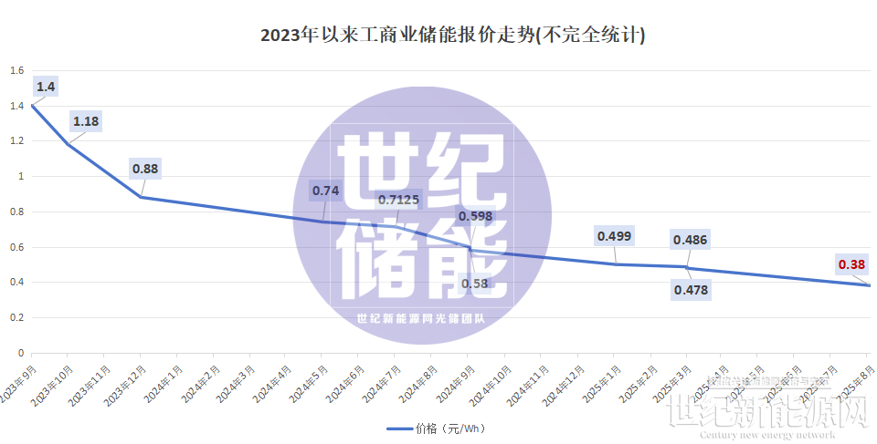 事实上,储能行业的价格内卷早已不是新鲜事。以工商业储能柜为例,自2023年9月以来,报价从1.40元/Wh跌至如今的0.38元/Wh,跌幅达72.86%,堪称 “砍到膝盖骨” 的降价。