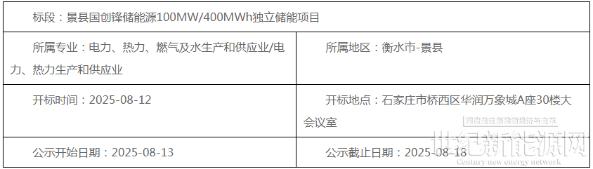 8月13日,景县国创锋储能源100MW/400MWh独立储能项目中标候选人公示。