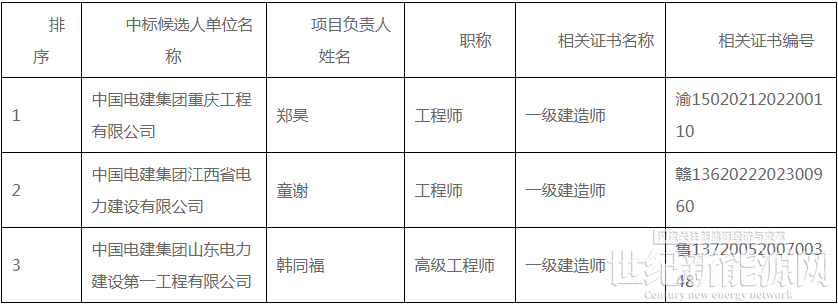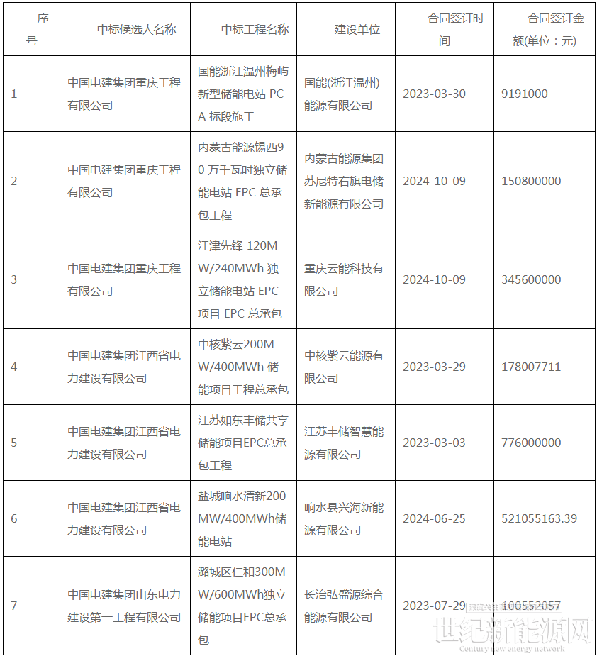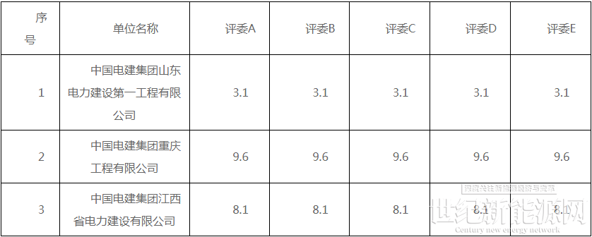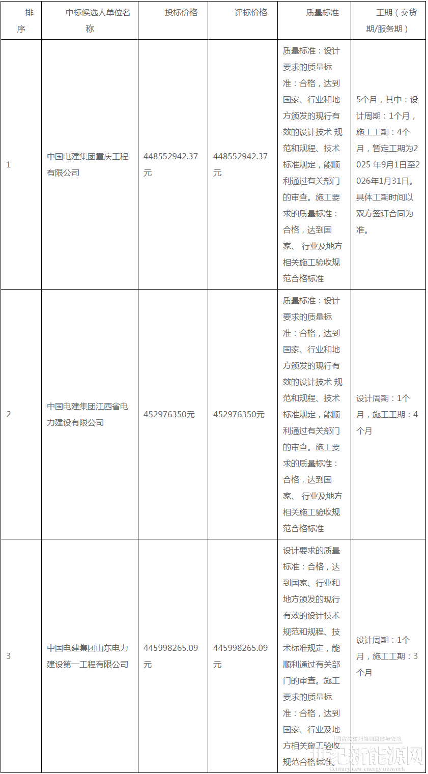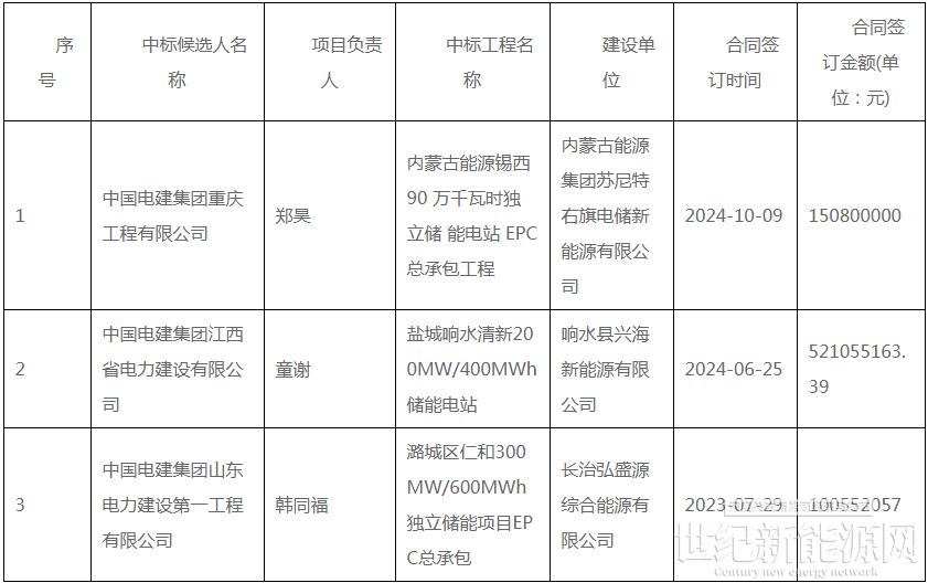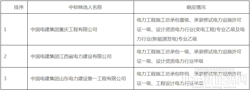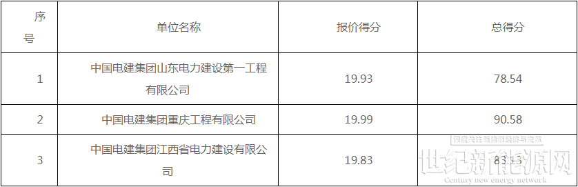 公告显示,项目第一中标候选人为中国电建集团重庆工程有限公司,投标报价为448552942.37元,折合单价1.1214元/Wh;第二中标候选人为中国电建集团江西省电力建设有限公司,投标报价为452976350元,折合单价1.1324元/Wh;第三中标候选人为中国电建集团山东电力建设第一工程有限公司,投标报价为445998265.09元,折合单价1.115元/Wh。