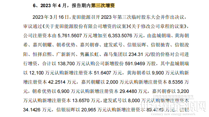 据招股书披露,2023年4月,麦田能源进行第三次增资,盐城朝瑞、黄海朝希、嘉兴朝耀、朝希优势、嘉兴朝睿等多家公司以234.31元/股的价格对公司进行增资,这五家认购新增注册资本合计3.41亿元,出资较多。
