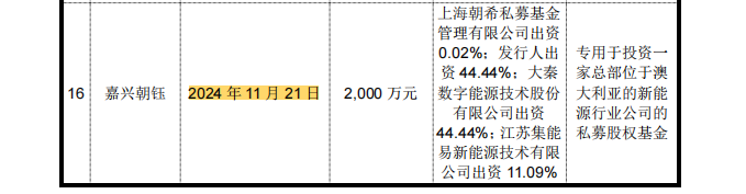 但麦田能源的招股说明书却显示,公司对嘉兴朝钰基金这2000万元的投资,实际发生在2024年11月21日,而非企查查显示的5月,更非在5月12日反对票之后,这又让整件事情的真相显得扑朔迷离。
