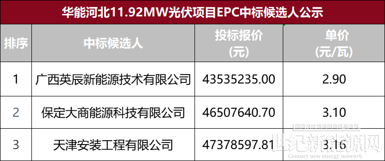 8月15日,华能华北分公司华能泰乐芦台东方诚二期11.92MW光伏发电项目EPC工程中标候选人公示,招标人为华能泰乐(唐山)绿色能源有限公司项目直流侧装机容量15012.15kWp,广西英辰新能源技术有限公司以2.9元/瓦位列第一候选人。