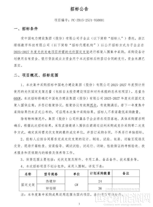 根据招标公告,本次招标总量为60GW。招标将确定中国电力建设集团(股份)有限公司 2025-2027 年度光伏固定支架入围供应商,并签订框架协议,框架协议有效期两年。