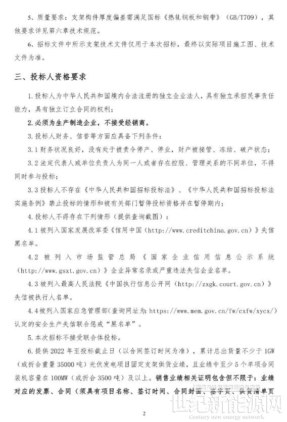 对于投标人业绩,电建要求:投标人需提供 2022 年至投标截止日(以合同签订时间为准),累计总出货量不少于 1GW(或折合重量 35000 吨)光伏发电项目固定支架供货业绩,且业绩中至少5个单项合同装机容量在 100MW(或折合 3500 吨)及以上。