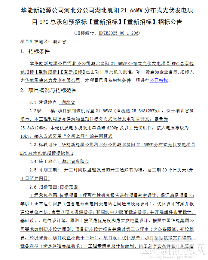 8月18日,华能新能源公司河北分公司湖北襄阳21.66MW分布式光伏发电项目EPC总承包预招标重新招标公告。