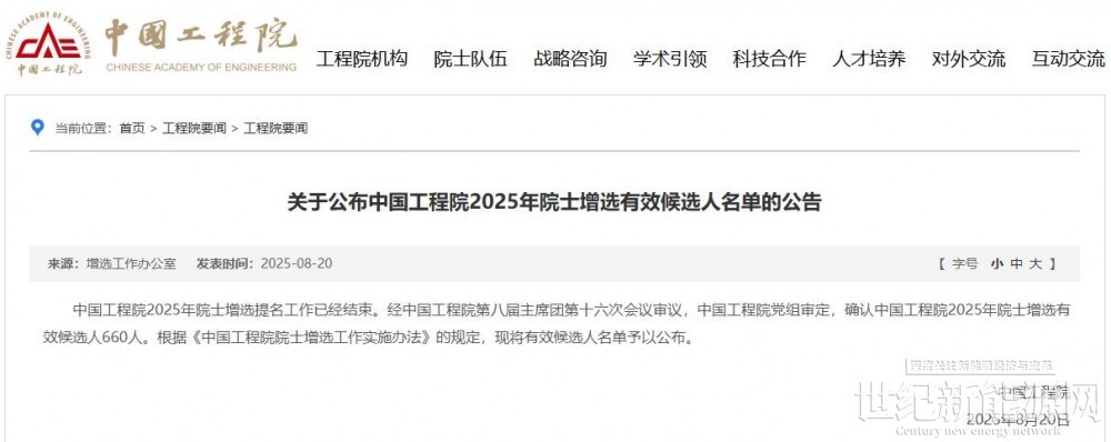 8月20日,中国工程院公布中国工程院2025年院士增选有效候选人名单。
