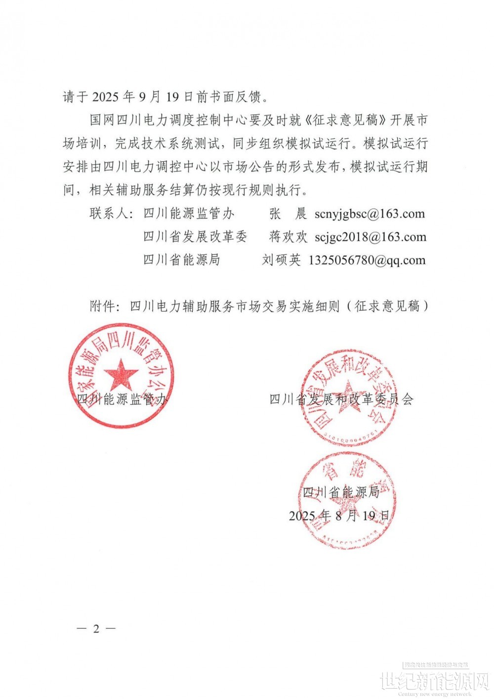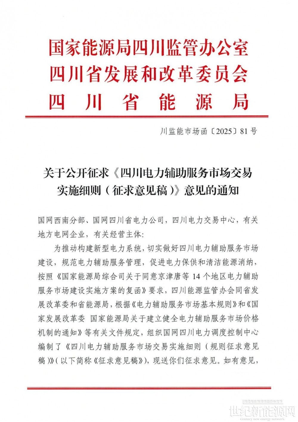 8月18日,国家能源局四川监管办公室发布关于公开征求《四川电力辅助服务市场交易实施细则(征求意见稿)》意见的通知。