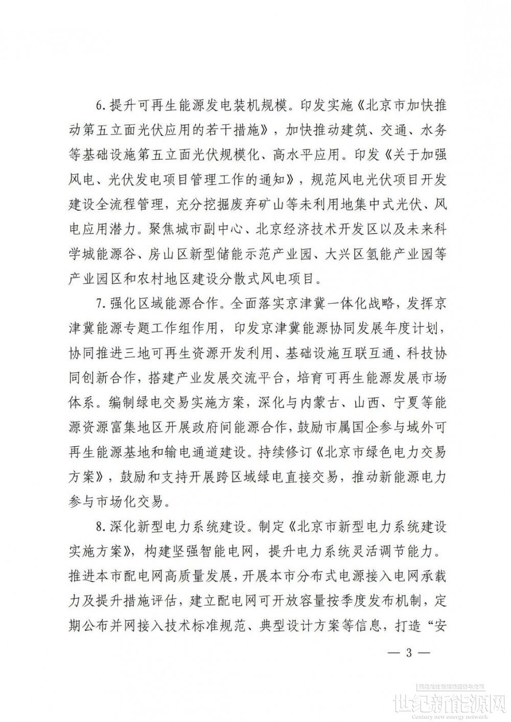 印发实施《北京市绿色先进能源和低碳环保产业发展实施方案》,支持光伏、风电、地热、污水(可再生水)余热、新型储能、氢能、智能电网等符合区域产业布局的可再生能源产业发展,推动完善上下游产业链、供应链,支持建设综合性、专业性的可再生能源产业集聚地和应用示范区。