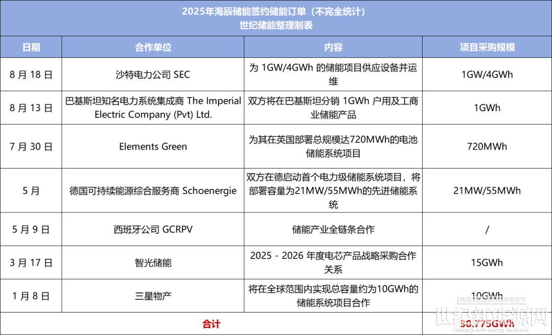 其市场增长同样体现在订单表现上。据世纪储能不完全统计,截至2025年8月,海辰储能签约订单量超过30GWh。
