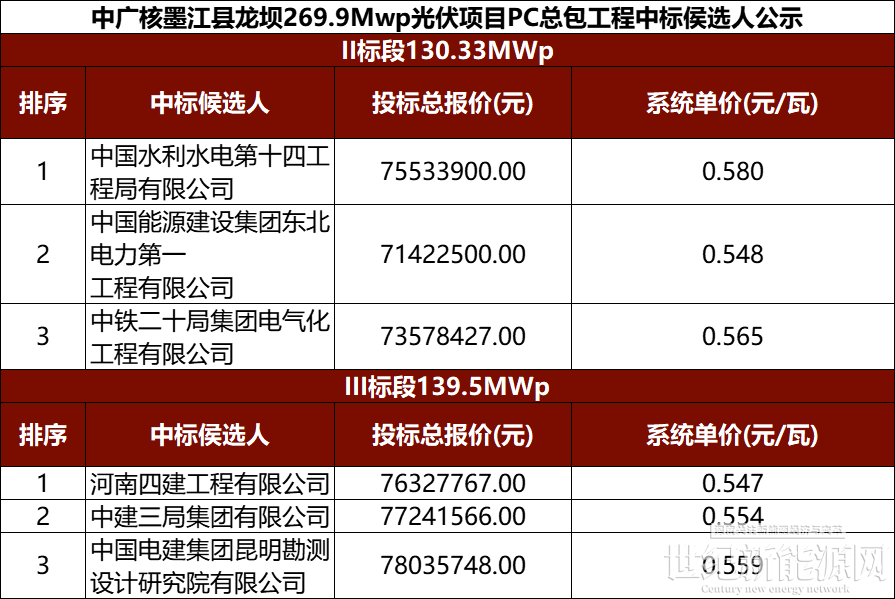 II标段:容量99.2MWAC/130.33MWDC,中国水利水电第十四工程局有限公司以0.58元/瓦位列第一候选人;
