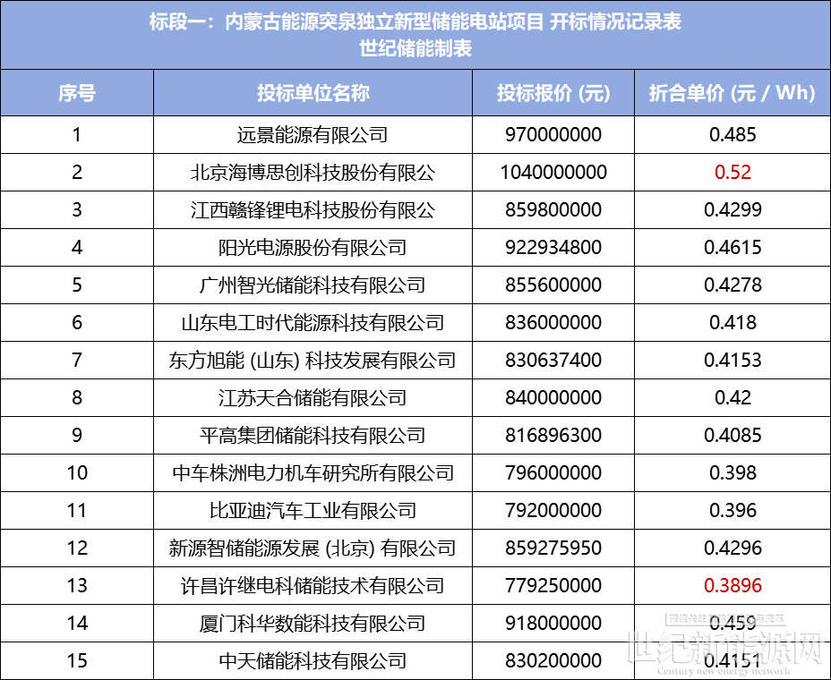 8月27日,内蒙古能源突泉独立新型储能电站项目、内蒙古能源苏尼特右旗30万千瓦/120万千瓦时独立储能项目储能系统设备采购(标段一:突泉;标段二:苏尼特右旗)开标,两个标段共计15家企业竞标(剔除重复企业),投标报价在0.3896~0.52元/Wh。