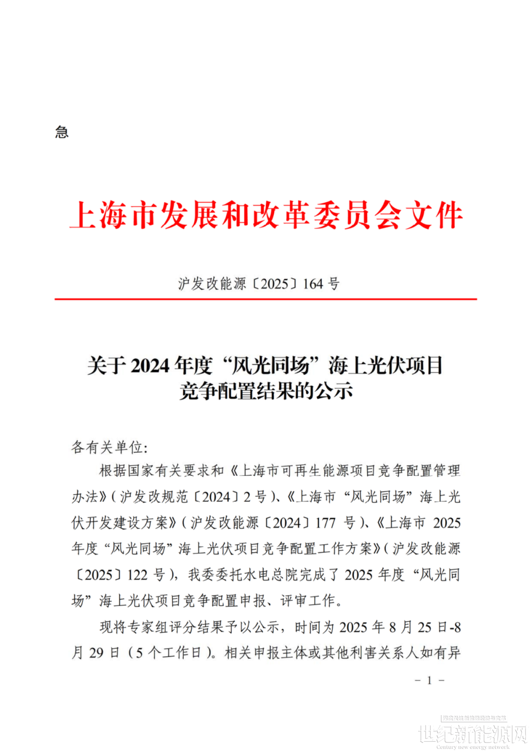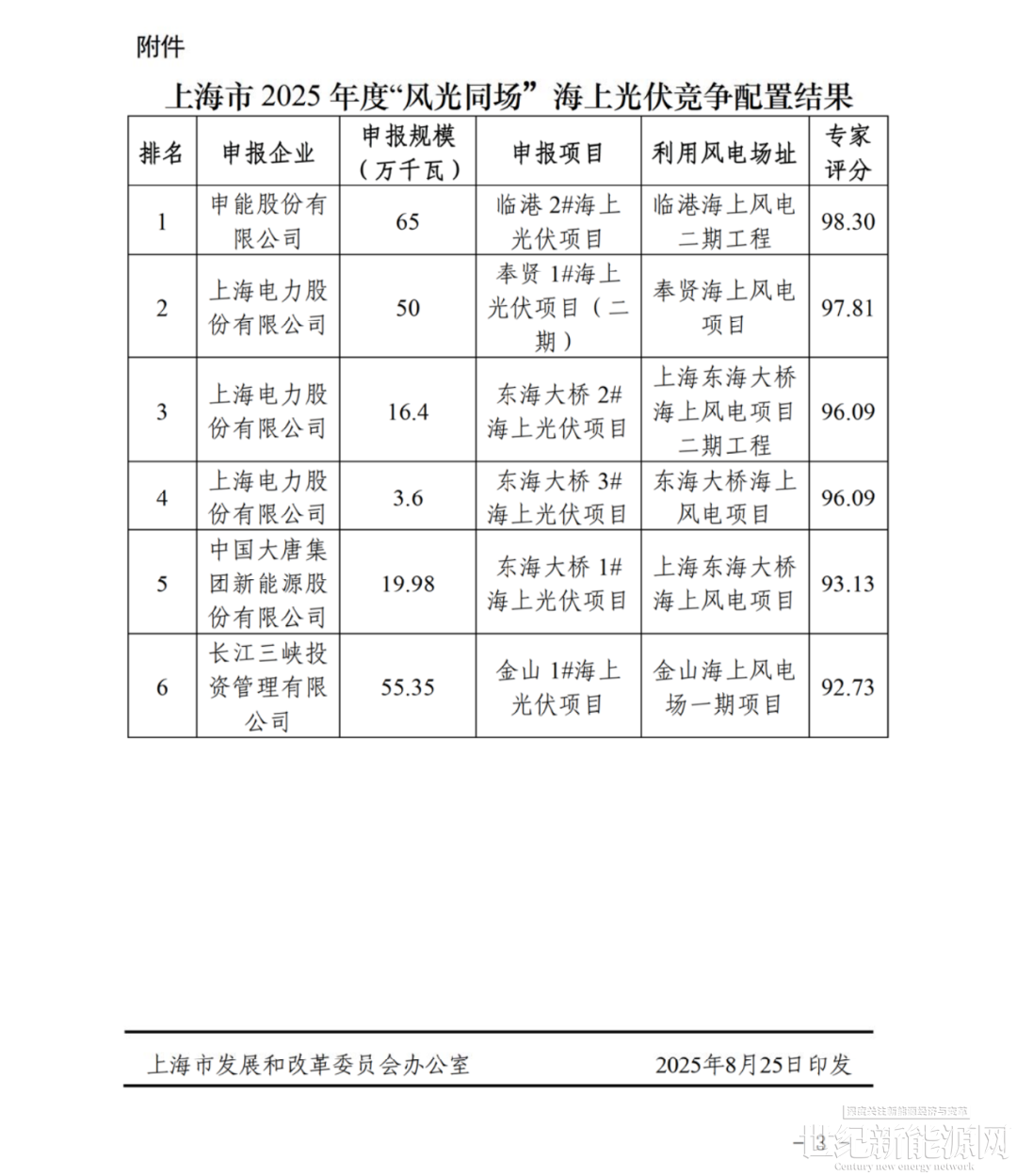 8月25日,上海市发改委公示《上海市2025年度“风光同场”海上光伏竞争配置结果》。