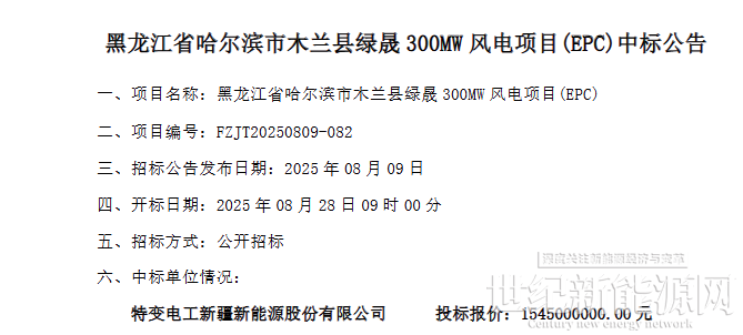 近日,黑龙江省哈尔滨市木兰县绿晟300MW风电项目EPC中标公示。