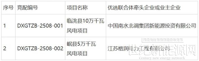 根据公示,临洮县10万千瓦风电项目中选企业为中国南水北调集团新能源投资有限公司,岷县5万千瓦风电项目中选企业为江苏格润电力工程有限公司。