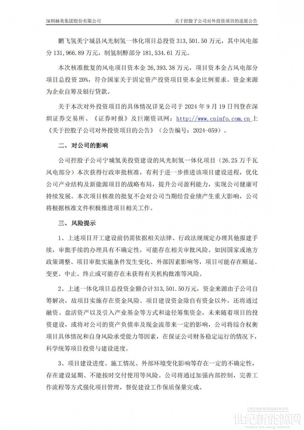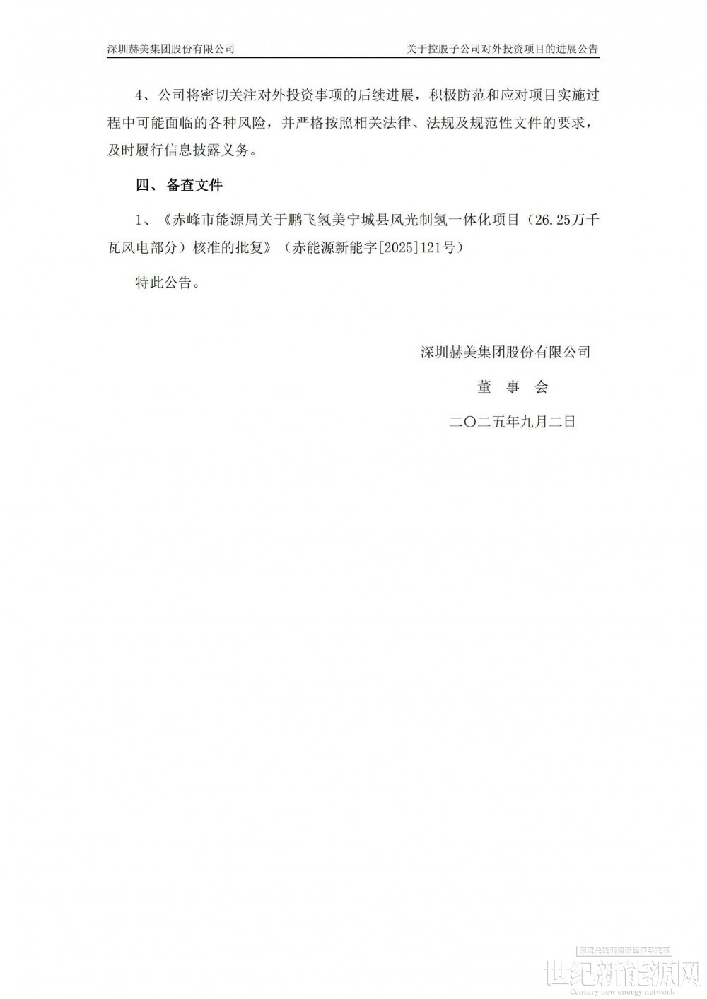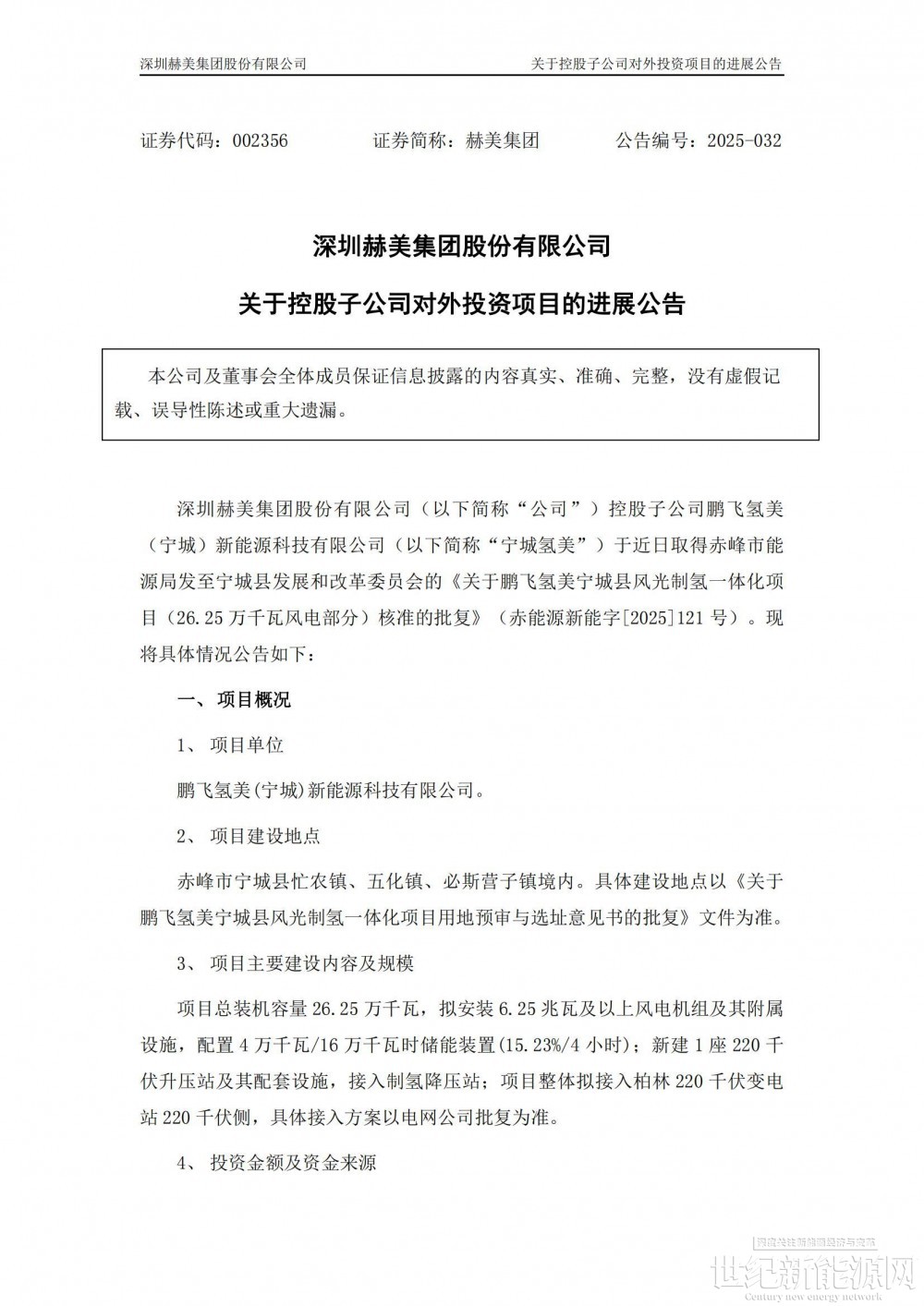 公告显示,深圳赫美集团股份有限公司控股子公司鹏飞氢美(宁城)新能源科技有限公司(简称“宁城氢美”)于近日取得赤峰市能源局发至宁城县发展和改革委员会的《关于鹏飞氢美宁城县风光制氢一体化项目(26.25 万千瓦风电部分)核准的批复》(赤能源新能字[2025]121 号)。