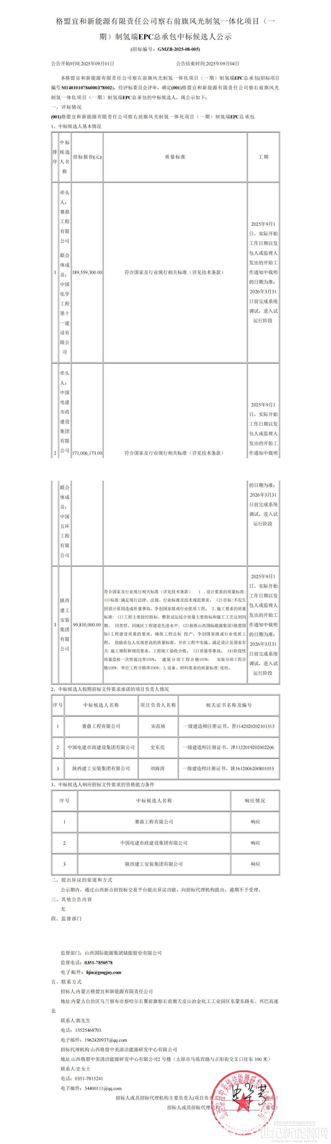 9月1日,格盟宜和新能源有限责任公司察右前旗风光制氢一体化项目(一期)制氢端EPC总承包中标候选人公示。