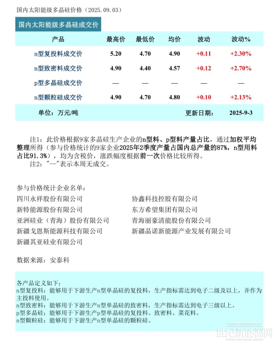 9月3日,中国有色金属工业协会硅业分会发布最新硅料价格。数据显示,本周硅料价格延续涨势,最高涨幅达2.70%,价格已连续10周上扬。