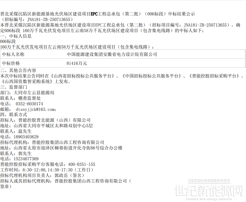 本晋北采煤沉陷区新能源基地光伏场区建设项目EPC工程总承包(第二批)(招标项目编号:JNA181-ZB-250713655),确定006标段 160万千瓦光伏发电项目左云南58万千瓦光伏场区建设项目(包含集电线路)的中标人如下: