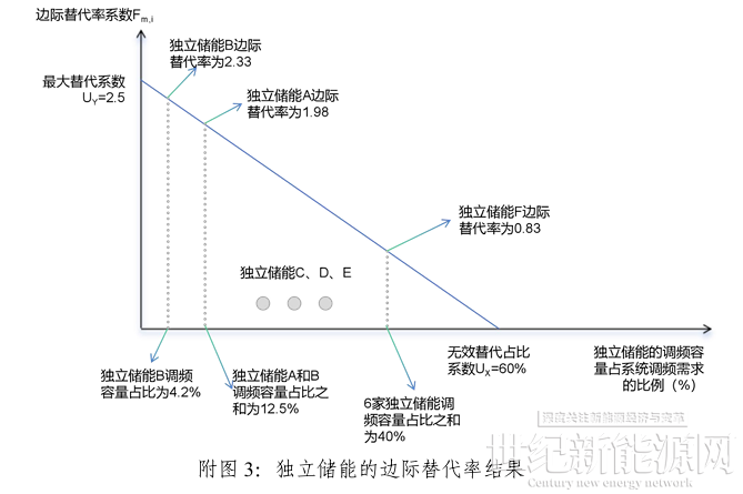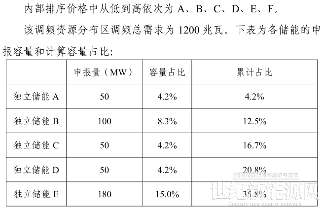 实施细则给出了一个计算实例。根据独立储能报价、性能、内部排序、申报量可知独立储能的边际替代率结果。